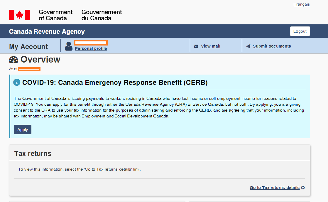 Once you have logged into your CRA account, you will find the COVID-19: Canada Emergency Response Benefit (CERB) application on top of your main page blue notification box.