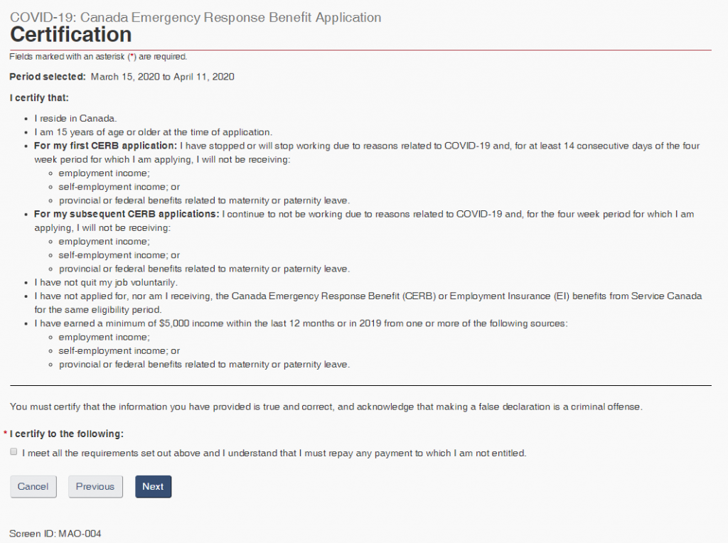 Once you have made a selection of your CERB entitlement period, you will be prompted to the Certification page where it ask you to put a check mark to confirm you have met the program requirement.