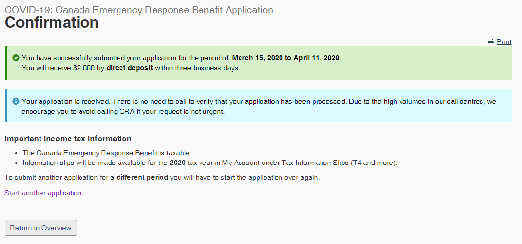Once you have finalized your CERB application, you will see the Confirmation page. You may return to your CRA account main page or “start another application”.