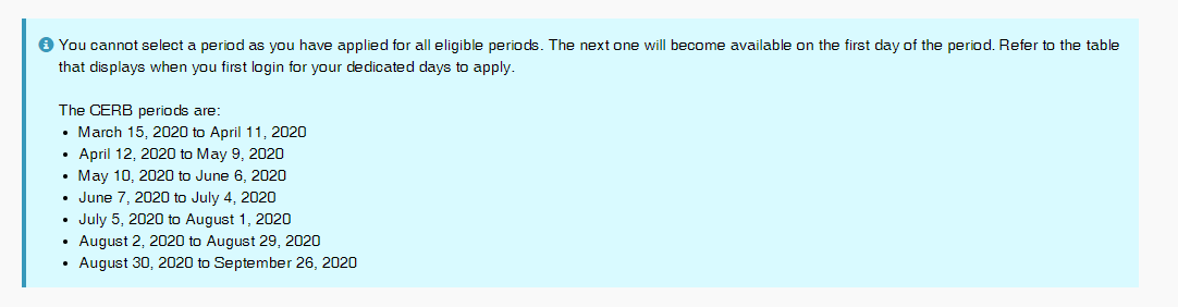 Note: You are required to re-apply to CERB every 4 weeks. Below are the upcoming qualification period until the current expecting end date of the program.